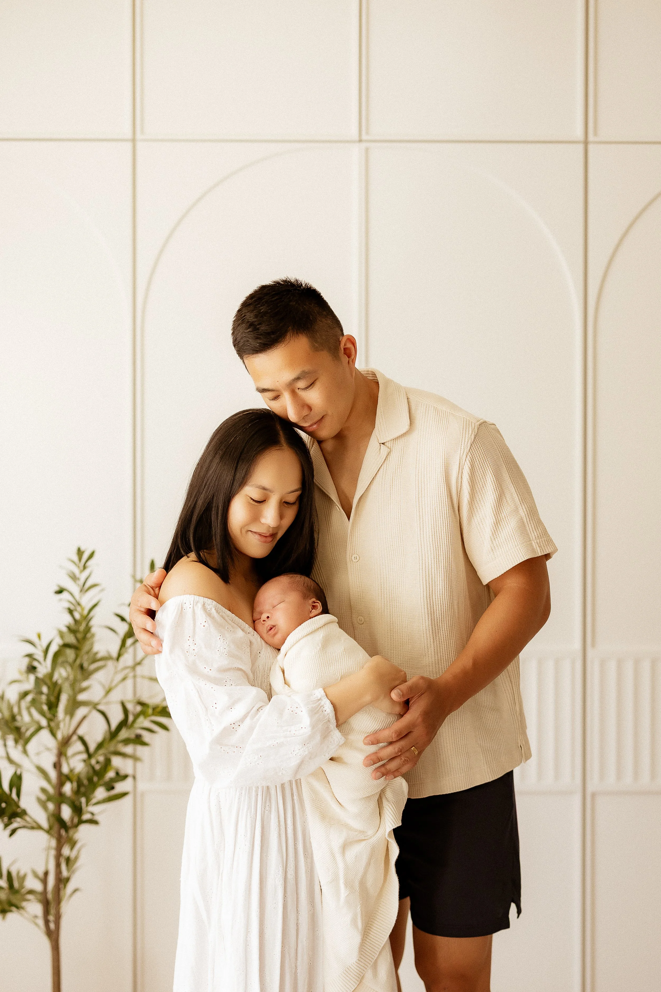 The studio was created out of a need for a beautiful place for new parents to land, especially if their home doesn’t have the natural light or space needed to capture the kind of photos they’re dreaming of. Many families love the ease of simply arriving, walking straight in with bub, and settling into a relaxed environment while I guide you through the session. Everything is here for you from blankets, wraps, rompers and even outfits for Mum.